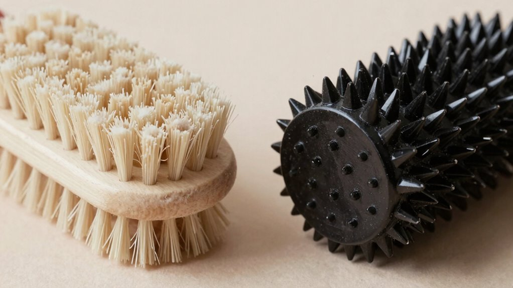 Gentle foot rollers feel soft and cushioned because they’re made from pliable materials or have smooth surfaces that distribute pressure evenly across your foot. Aggressive rollers, on the other hand, have firmer textures, ridges, or pointed designs that deliver deeper, concentrated pressure. The difference also depends on how much force you apply during use. Understanding these traits can help you choose the right roller for your needs, and there’s more to discover if you keep exploring.