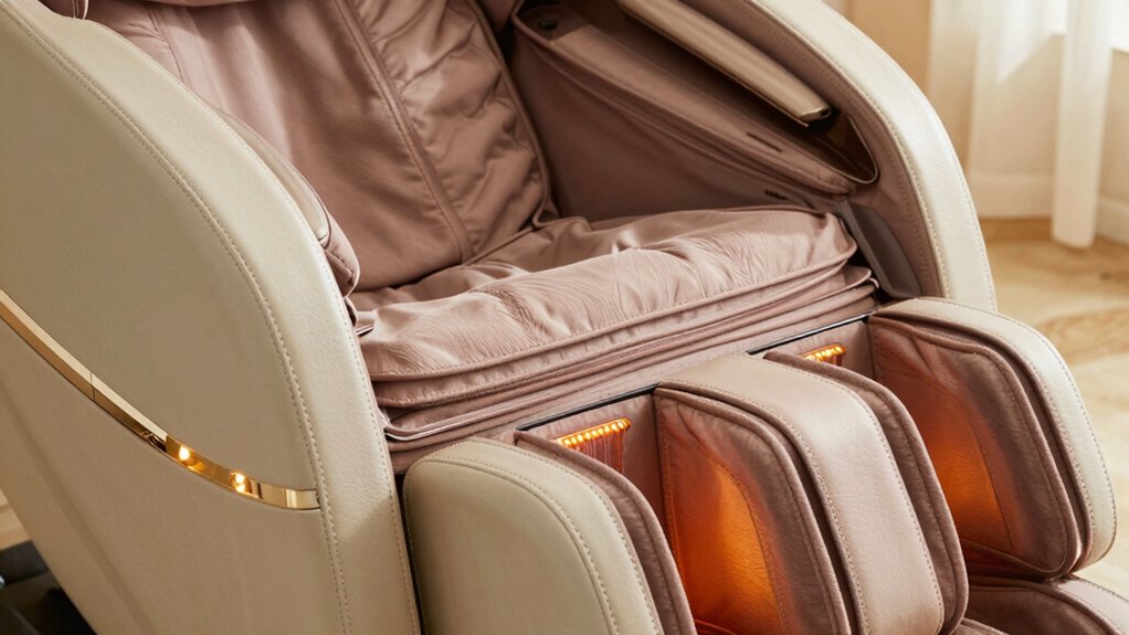 Heat therapy in massage chairs involves the use of gentle warmth to enhance your relaxation experience. When you activate this feature, it creates a sense of thermal comfort that soothes your muscles and eases tension. This warmth works alongside relaxation techniques by increasing blood flow and loosening tight muscles, making it easier for you to unwind. The soothing heat helps you relax mentally and physically, reducing stress and promoting a calming environment. By targeting specific areas, heat therapy encourages deeper relaxation, allowing you to fully enjoy your massage session. It’s a simple yet effective way to amplify the benefits of your massage chair, helping you feel more comfortable and rejuvenated after each use. Energy-efficient technology in modern massage chairs further enhances the sustainability of heat therapies, reducing energy consumption while delivering effective warmth. Incorporating infrared heat can provide even deeper penetration and relaxation benefits compared to standard heating methods.