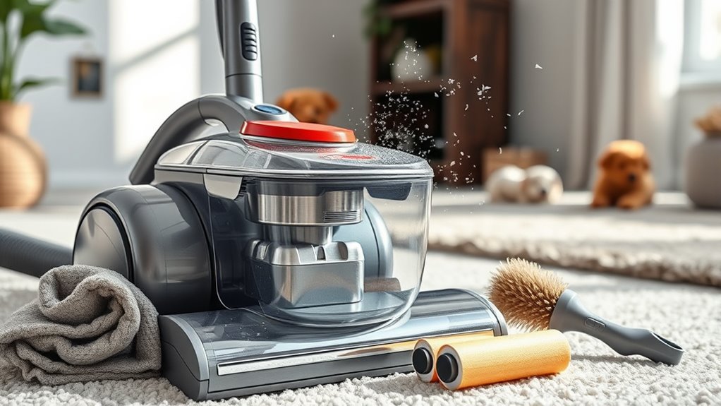 Selecting the right vacuum cleaner is essential for effectively controlling dust and pet hair around your home. Different types offer unique advantages, so choosing wisely guarantees better cleaning results. Canister vacuums are lightweight and easy to maneuver, perfect for stairs and furniture. Upright vacuums excel at deep cleaning carpets and are often equipped with powerful suction. Handheld models are convenient for quick cleanups and tight spaces. Stick vacuums are lightweight and cordless, ideal for daily maintenance. To keep your vacuum performing well, regular vacuum maintenance is key, including filter replacement to maintain suction power. Consider your specific needs and home layout when selecting a model, and always follow manufacturer instructions for peak performance. Additionally, understanding suction power and cleaning modes can help you pick a model that effectively handles pet hair and dust.