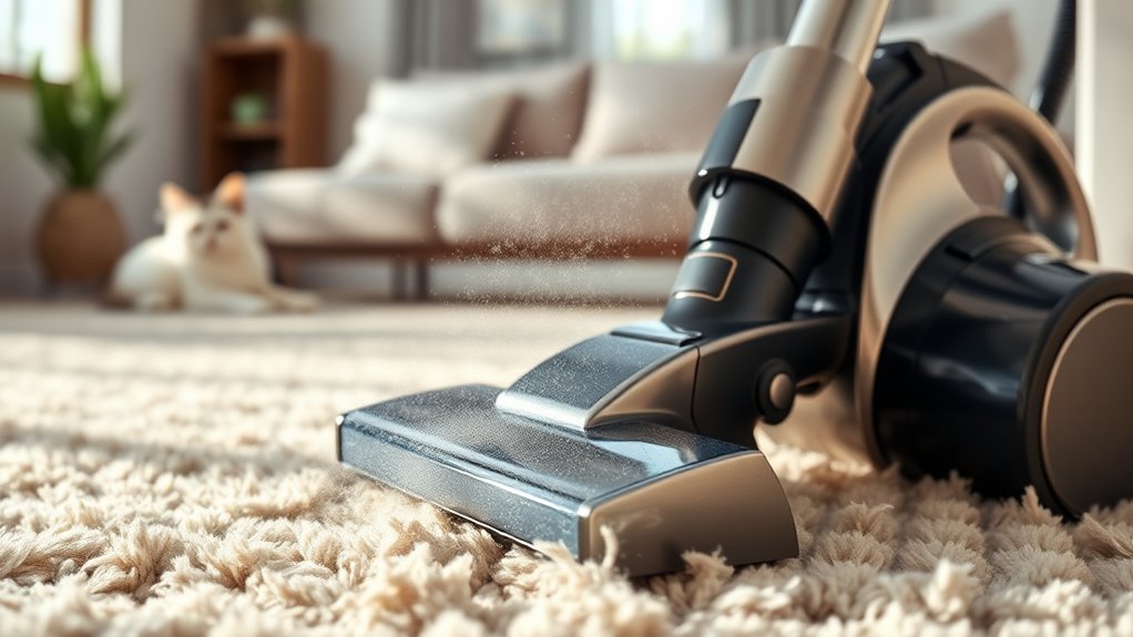 To keep dust and pet hair from spreading during vacuuming, use proper technique by moving slowly and overlapping passes. Air purifiers can help capture airborne particles, reducing overall dust in the room. Regularly maintain your vacuum and cleaning routines to guarantee peak performance and minimize debris escape. Additionally, choosing a vacuum with advanced filtration systems can further improve dust and allergen removal.