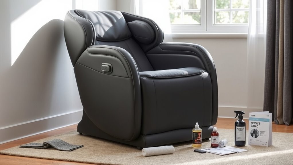 To prevent mold and bacteria buildup inside your massage chair, you should follow regular cleaning routines using a mild disinfectant on all surfaces. Make sure to wipe down the upholstery after each use and deep clean weekly. Additionally, improve ventilation by keeping the chair in a well-ventilated room and avoiding excess humidity. These steps help maintain hygiene and extend your chair’s lifespan.
