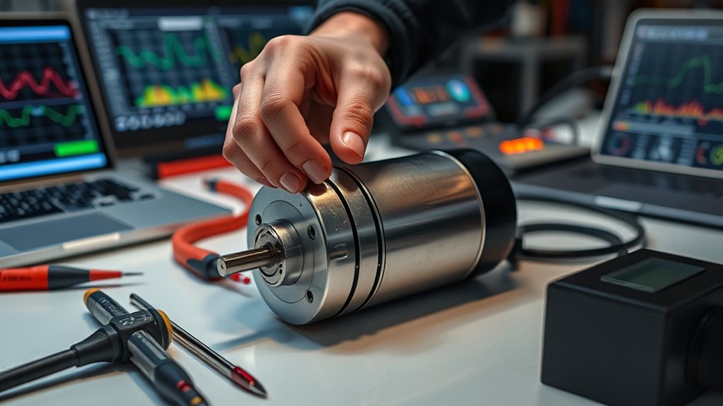 Performing performance tests is essential for verifying that your motor calibration is accurate and reliable. These tests help identify issues like sensor misalignment or thermal effects that could skew results. To guarantee thorough testing, consider these steps: