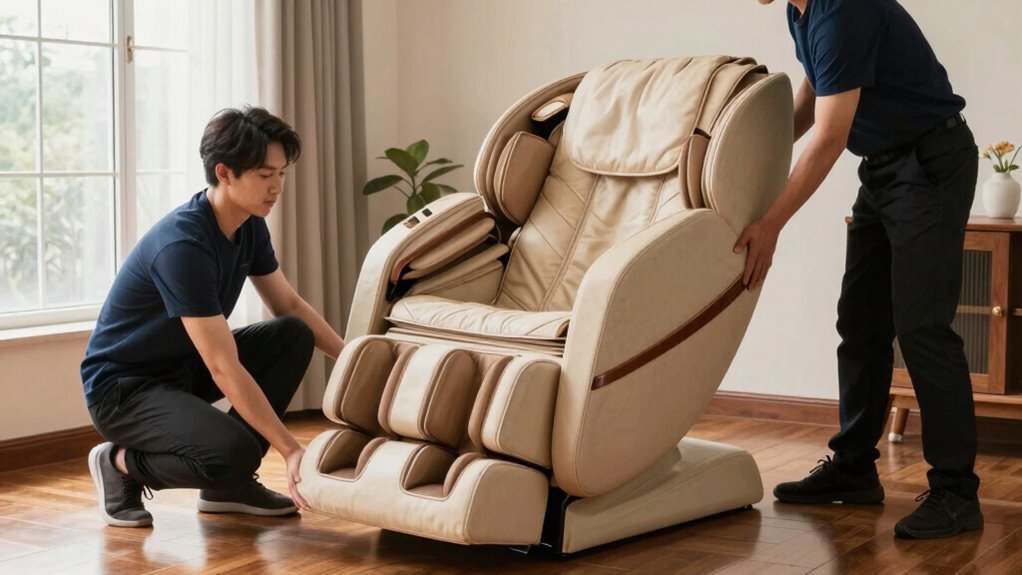 Moving a massage chair through doorways and up or down stairs can be tricky, but careful planning makes the process smoother. Before moving, protect the fabric by wrapping the chair in blankets or plastic covers to prevent tears and stains. When maneuvering tight spaces, verify you have a clear path and consider removing handles or side panels if possible. Proper weight distribution is crucial—lift with your legs, not your back, and keep the chair balanced to avoid sudden shifts. Tilt the chair carefully to pass through doorways, maintaining an even grip to avoid damaging the fabric or frame. Communicate clearly with anyone helping, and take your time to prevent accidents or damage. With attention to these details, your move will be safer and more efficient.