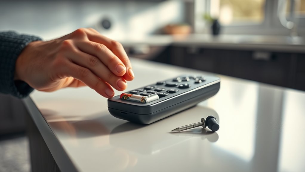You can’t replace batteries in all remote types with the same method because of universal compatibility and battery type identification. Different remotes may require specific tools or battery sizes, so always check your remote’s manual or look for markings to identify the correct battery type. While some remotes share similar batteries, always verify compatibility first to avoid damage or malfunction during replacement.