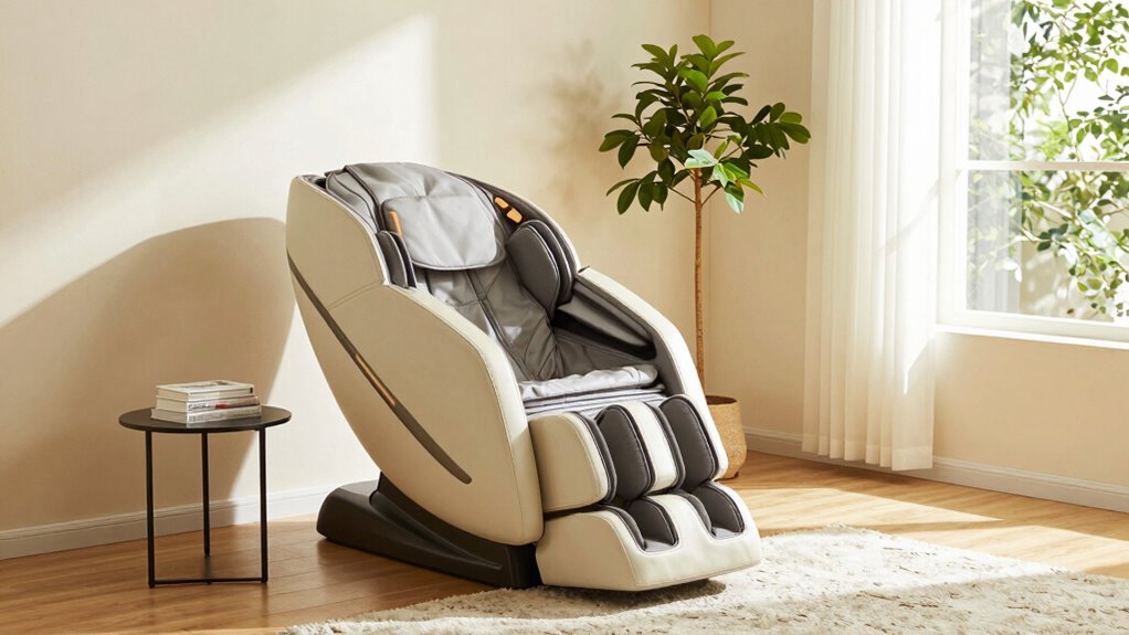 Choosing the right room for your massage chair is essential to maximize comfort and functionality. Start by considering lighting placement; natural light creates a calming atmosphere, while adjustable lamps help you set the mood. Avoid harsh, direct lighting that can disrupt relaxation. Decor choices also matter—opt for soothing colors and minimal clutter to promote tranquility. Keep the space inviting without overwhelming it with decorations. The room should feel open and peaceful, making it easier to unwind during your massage sessions. Guarantee the room is private and free from distractions. Additionally, proper acoustics can significantly enhance your relaxation experience by reducing noise disturbances. Incorporating soundproofing techniques can further improve the environment, ensuring peace during your sessions. Creating a designated relaxation space with these considerations can help establish a consistent and calming routine. It’s also beneficial to consider room size to ensure ample space for comfortable positioning and movement. By thoughtfully selecting a space with balanced lighting and calming decor, you’ll create an ideal environment that enhances your relaxation experience every time. Paying attention to environmental factors like temperature and airflow can also contribute to a more enjoyable massage session.