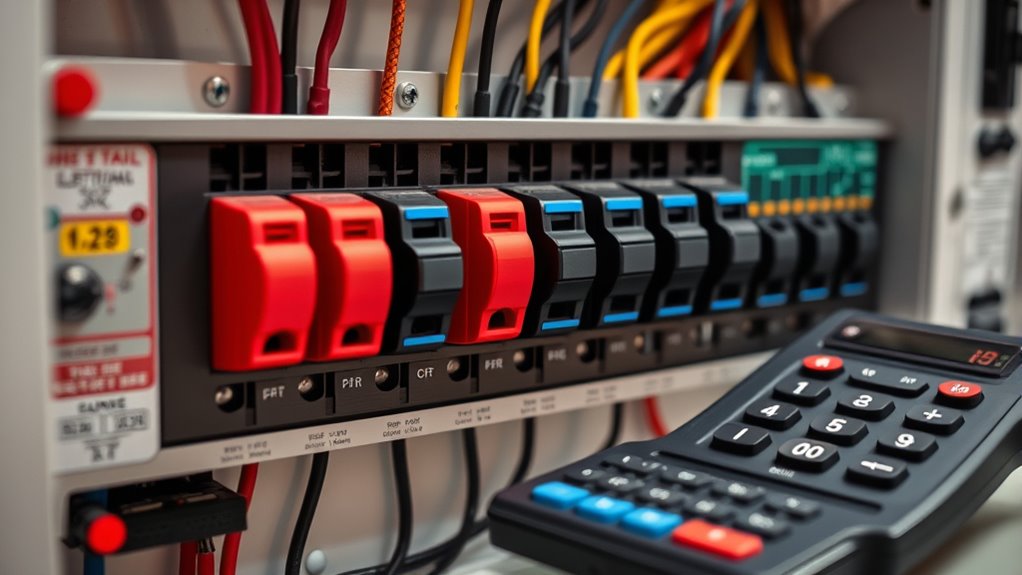Using the right calculation tools is essential to accurately identify the breaker size your electrical system needs. Proper tools help guarantee circuit compatibility and correct breaker selection, preventing overloads or under-protection. When choosing tools, consider devices like load calculators, circuit analyzers, and the NEC tables, which provide precise measurements. These tools help you analyze wire gauge, device load, and circuit length, ensuring your breaker matches the system’s demands. Remember, incorrect calculations can lead to fire hazards or equipment damage. By using reliable calculation tools, you reduce guesswork and improve safety. Keep these points in mind: