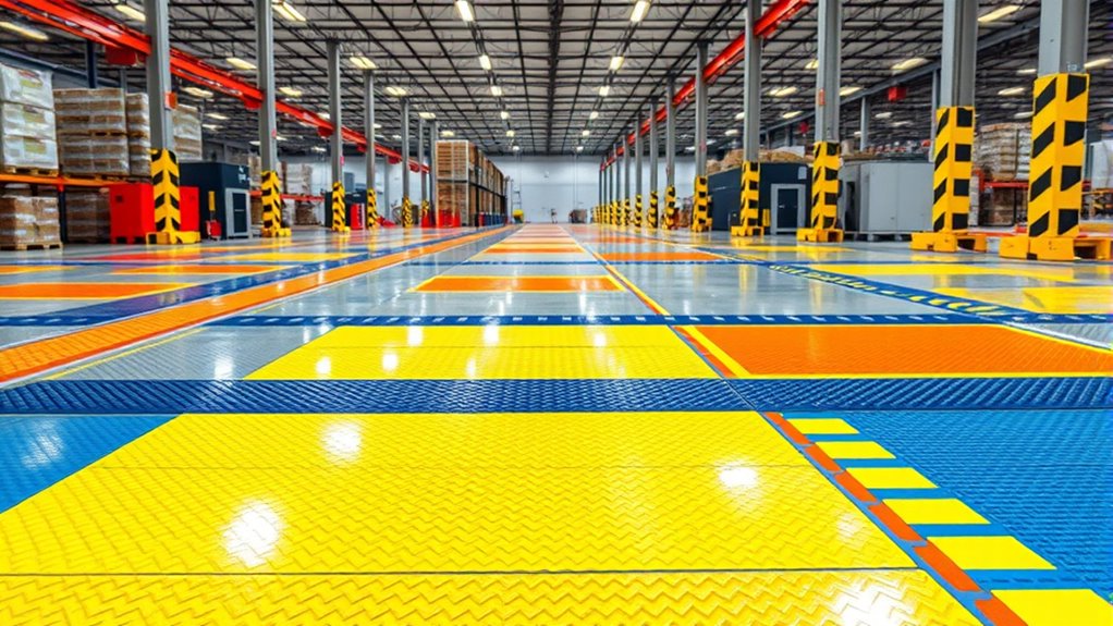 Understanding the key regulations for floor protection is crucial to guarantee compliance and prevent damage. Industrial regulations set specific requirements for floor mats, ensuring they can handle heavy machinery, foot traffic, and chemical exposure. Environmental standards emphasize eco-friendly materials, low emissions, and safe disposal practices. You must verify that mats meet safety codes, such as non-slip surfaces and fire resistance, to reduce accidents. Many regulations also mandate proper installation and maintenance to maintain their protective qualities. Staying compliant helps avoid fines and legal issues while protecting your workers and property. Additionally, industry-specific standards often specify particular material and performance criteria to ensure maximum safety and durability. Keep in mind that regulations can vary by industry and location, so regularly consult relevant standards. By understanding these regulations, you ensure your floor protection measures are both effective and compliant.