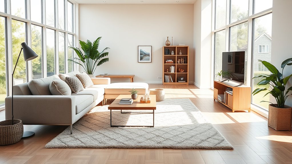 Balance these elements so no piece dominates, ensuring your room feels cohesive and welcoming. Proper scale harmony enhances both comfort and style, making your space feel thoughtfully designed. Incorporating furniture scale into your layout ensures a balanced and inviting environment.