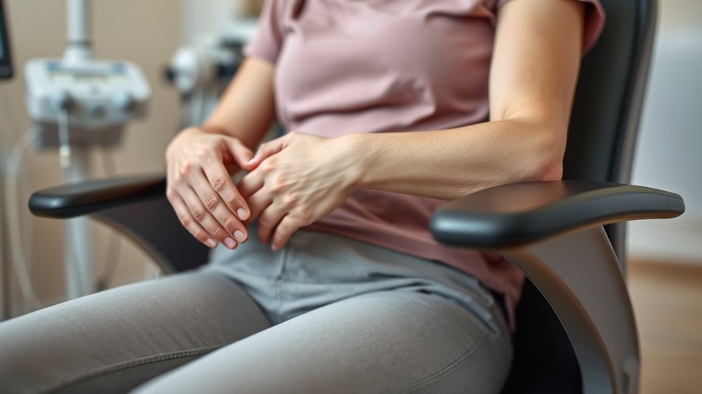 If you experience dizziness, severe headache, or numbness while sitting, stop immediately. You might notice poor posture or discomfort worsening, which signals it’s time to make posture adjustments or use ergonomic accessories. If symptoms persist or intensify, avoid sitting altogether and seek medical advice. Prioritize your safety by listening to your body and making necessary adjustments to prevent further issues.