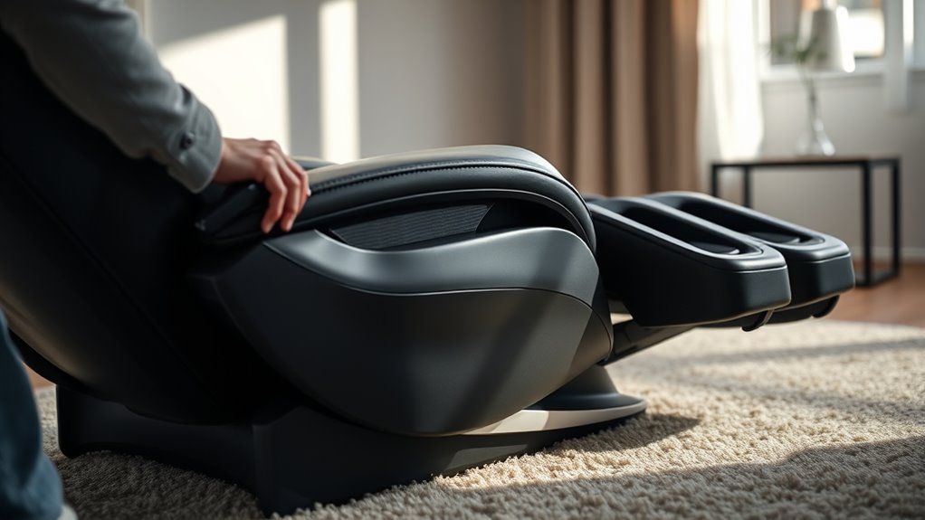 Pregnancy safety is vital, so you should avoid using massage chairs unless your healthcare provider says it’s okay. The gentle, automated massage might seem helpful, but it could pose risks during pregnancy. Think of it as a medical substitution—your body’s needs change, and what’s safe for others isn’t always safe for you. Always consult your doctor before trying any massage chair to guarantee your and your baby’s safety.