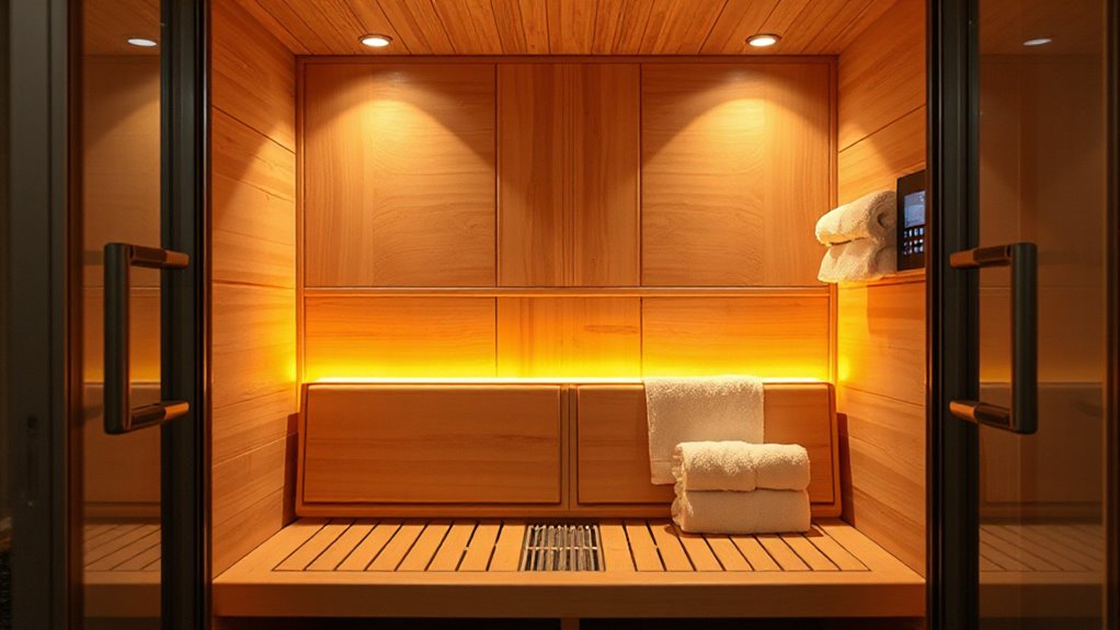 Efficient heating technology is essential for a satisfying infrared sauna experience, as it determines how quickly and evenly the space warms up. I look for low EMF carbon or mica panels, which provide deep heat with minimal electromagnetic exposure, ensuring safety and comfort. The wattage of the panels, usually between 1500W and 2180W, impacts how fast the sauna reaches temperature and maintains consistent warmth. Dual or multiple panels help distribute heat evenly across the entire space, enhancing comfort and therapeutic benefits. I also consider wavelengths between 6-15μm, especially red light, which can promote muscle relaxation and recovery. Energy-efficient models with optimized panel placement and appropriate wattage not only deliver effective heat therapy but also help reduce operating costs, making them a smart investment.