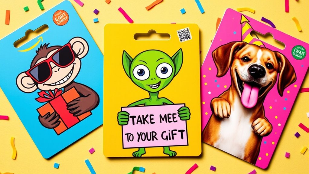 Choosing a funny design for an Amazon e-gift card isn’t just about making it look amusing; it’s about guaranteeing the humor fits the occasion. You want the joke or theme to resonate appropriately, whether it’s a birthday, holiday, or professional event. For birthdays, playful or silly humor works well, while holiday-themed designs add a festive touch. Consider the formality of the setting—what’s fun for friends might not suit colleagues or clients. If the gift is for a family gathering, ensure the humor is suitable for all ages. Matching the design’s tone to the event’s vibe helps avoid awkward moments. Ultimately, selecting an occasion-appropriate funny design shows thoughtfulness and makes the gift more meaningful and well-received.