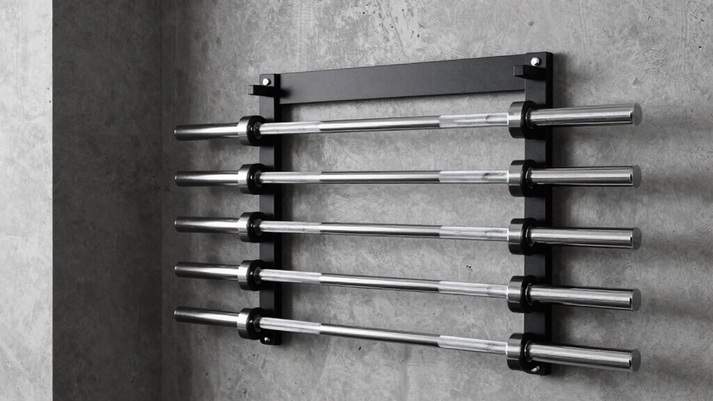 Choosing the right wall mount is like finding the perfect spot for your favorite artwork—it keeps things neat and ready without cluttering your space. With these options, you’ll have a sturdy home for your barbell, ensuring it’s always within reach and beautifully organized. Trust me, a well-placed mount transforms your workout area into a sleek, inviting space—where every lift feels just a little more inspiring.
