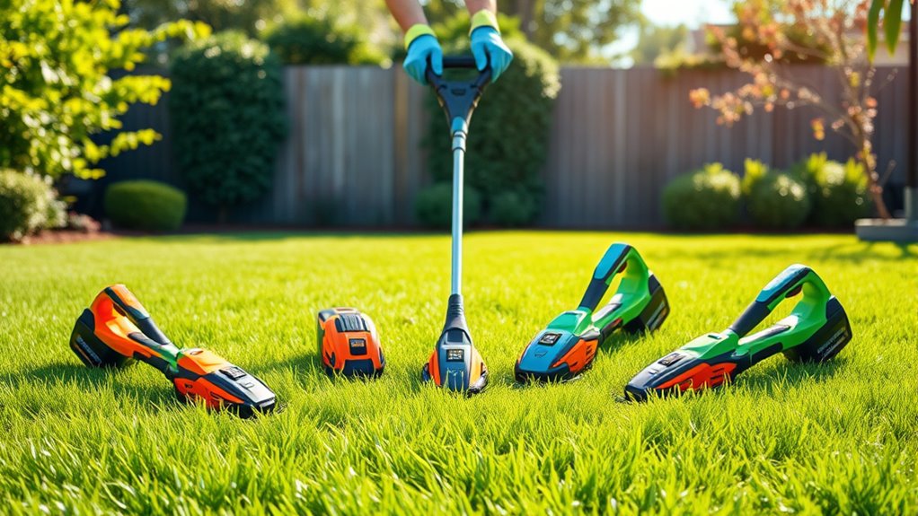 You might think safety features are just fancy add-ons, but these trimmers have real safeguards. I appreciate the automatic shut-off that activates if I accidentally let go, and the blade guards that prevent debris from flying. Most also include ergonomic handles to reduce fatigue, which keeps me safer and more in control. Honestly, these thoughtful features make yard work less risky and way more manageable.