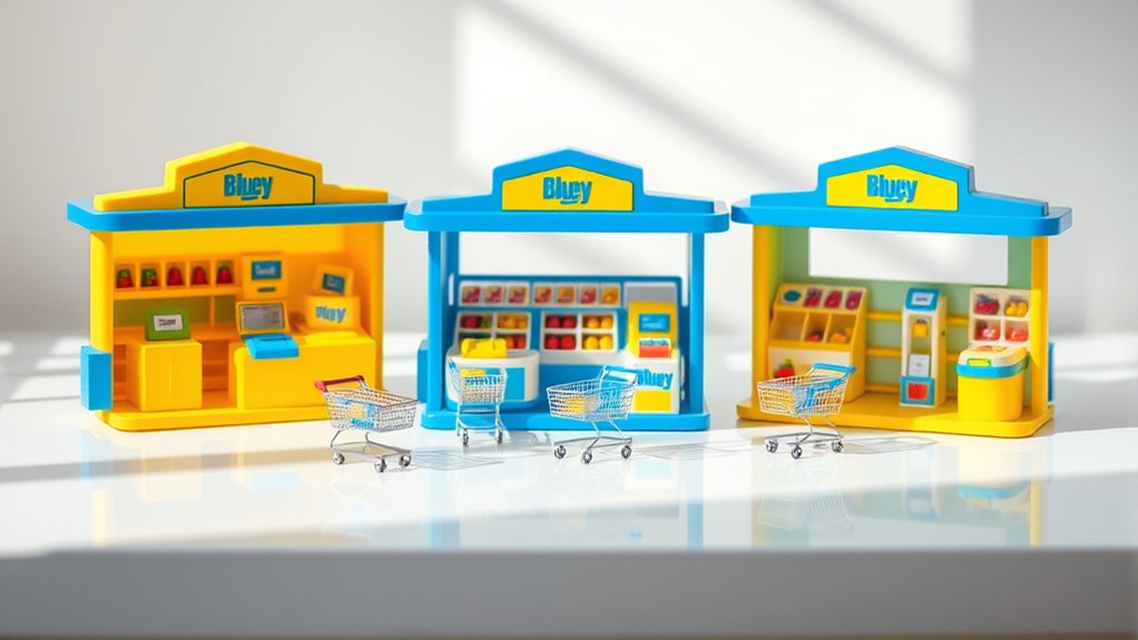 Choosing a Bluey supermarket playset that fits your budget requires careful comparison of prices across various retailers and online stores. I recommend setting a clear price range beforehand to help narrow your options and prevent overspending on features or accessories that aren’t essential. Be sure to take into account the cost of additional accessories or expansion sets needed for a complete play experience, as these can add up. Look for value-packed bundles that include multiple accessories or characters at a reasonable price, offering more for your money. Also, keep an eye out for extra costs like shipping fees or taxes, which can impact the total price. Comparing these factors ensures you find a playset that’s both fun and financially manageable.