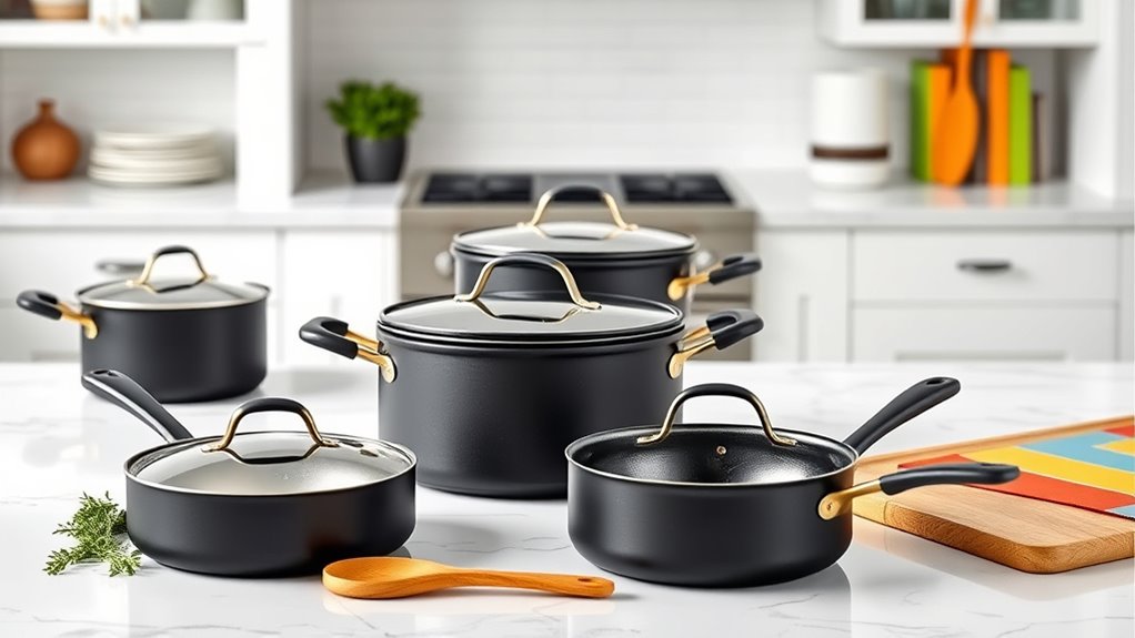 Choosing a Caraway cookware set requires paying close attention to material safety standards, as these determine whether the cookware is free from harmful chemicals like PFOA, PFAS, lead, and cadmium. Ensuring safety means selecting cookware made from non-toxic materials such as ceramic, glass, or certain metals that meet strict safety guidelines. Reputable manufacturers adhere to regulations set by agencies like the FDA and EFSA, which help minimize toxic leaching during cooking. Certifications from organizations like NSF International or GreenGuard further confirm that the cookware has passed rigorous safety and environmental tests. By prioritizing these standards, I can confidently enjoy healthier meals without worrying about harmful chemicals contaminating my food, making safety a key factor in my buying decision.