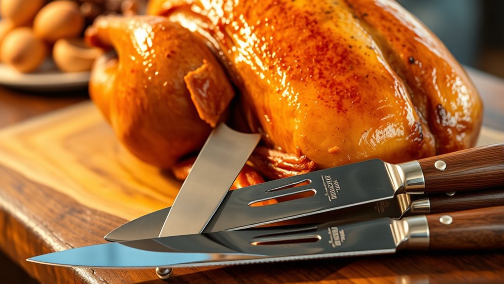 Choosing a carving knife set with a comfortable, ergonomic handle can make a significant difference during holiday turkey preparations. A well-designed handle reduces hand fatigue, allowing me to carve smoothly and accurately for longer periods. Handles made from non-slip materials provide a secure grip, even when my hands are wet or greasy, enhancing safety. Full tang construction offers better stability and balance, making the knife feel more controlled. Handles shaped to fit naturally in my hand help reduce strain on my wrist and improve precision with each slice. The weight and texture of the handle also play vital roles; a comfortable feel makes handling large turkeys easier and more enjoyable. Prioritizing handle comfort ensures a safer, more efficient carving experience during those busy holiday moments.