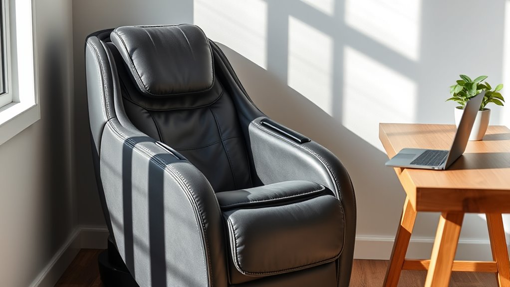 Choosing a compact massage chair for your home office means paying close attention to its space-saving features. I look for models with a small footprint, usually under 30 inches wide, so it fits easily into tight spaces. Foldable or retractable components, like footrests or backrests, are a huge plus—they let me maximize space when the chair isn’t in use. Slim profiles help the chair slide into corners or against walls without blocking access or movement. Low-profile designs are especially helpful if ceiling height is limited. I also consider whether the chair has a wall-hugging feature, making storage and placement more flexible in multi-purpose rooms. Overall, a well-designed space-saving feature guarantees relaxation without sacrificing valuable room or convenience.