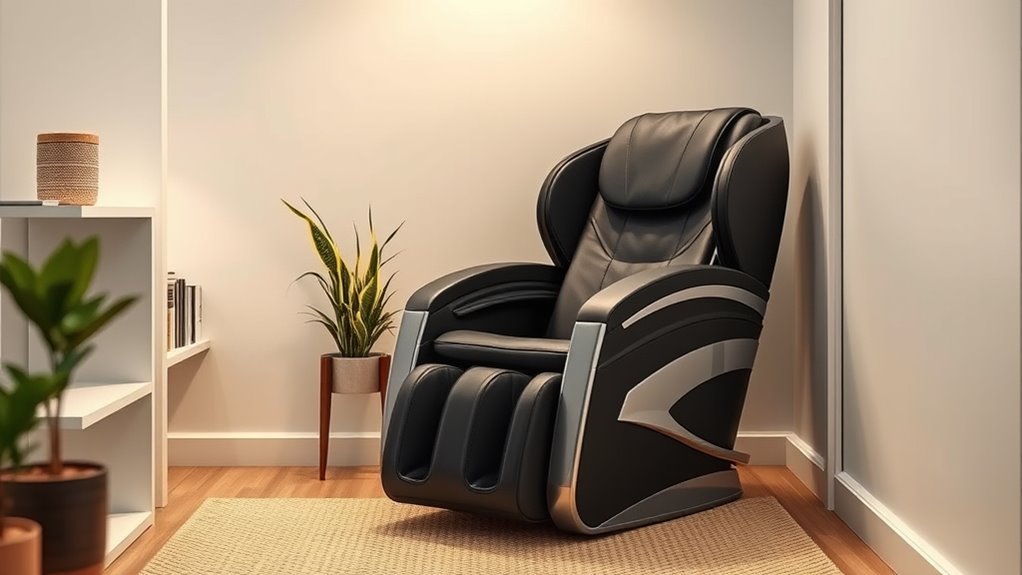 Are you choosing a compact massage chair for a small space? The design and aesthetics are vital to guarantee it enhances your room rather than overwhelms it. First, check the size and dimensions to verify it fits comfortably without crowding your area. Opt for a sleek, modern look with neutral colors and clean lines that blend seamlessly with your decor. Consider shapes like L-shaped or armless styles that maximize functionality while minimizing footprint. The visual style should be minimalist or streamlined to avoid a bulky appearance. Also, prioritize lightweight, portable designs that are easy to move when needed. A well-chosen aesthetic can transform your space into a relaxing retreat without sacrificing style or comfort.