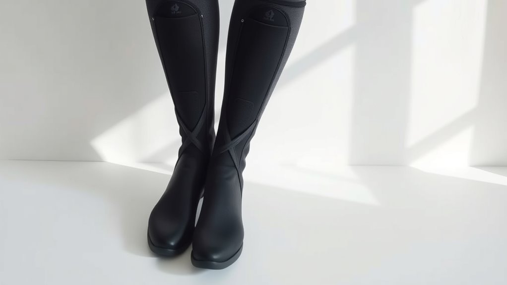 Choosing the right compression boots starts with ensuring they fit properly; a snug fit provides effective compression without restricting blood flow or causing discomfort. To do that, check the maximum leg circumference the boots can accommodate to ensure they’ll fit comfortably. Look for models with adjustable straps or Velcro closures so you can customize the fit to your leg’s shape and size. Multiple size options or customizable settings help achieve a precise, comfortable fit. Also, consider the tapering design and overall length—these should cover from your ankles up to your thighs if needed, ensuring proper coverage for targeted relief. Remember, the goal is a secure fit that supports circulation without feeling too tight or restrictive.