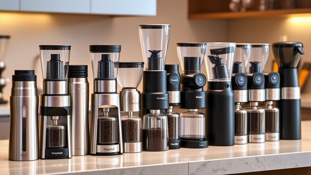 Think of these grinders as versatile artists, ready to master any roast. They handle light, medium, and dark beans with ease, ensuring consistent grind size that highlights each roast’s unique flavors. I’ve found they adapt well, revealing rich aromas whether I’m brewing a delicate light roast or a bold dark one. Their precision makes them reliable partners, turning every bean into a perfect cup—no matter the roast type.