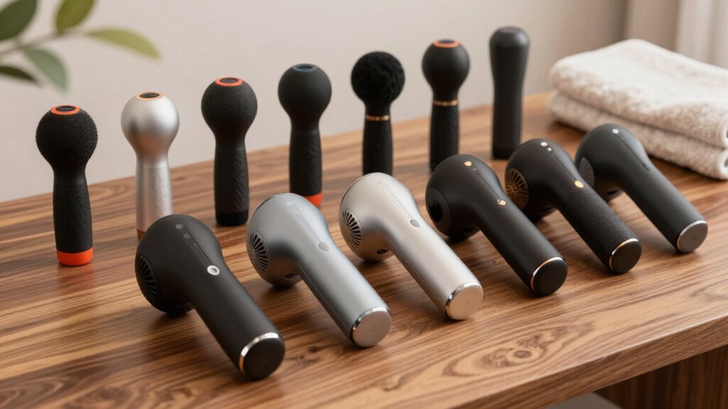 When selecting a cordless percussion massager, considering its noise level is essential because a quieter device can make your experience more comfortable and discreet. Lower noise levels, typically below 50 decibels, create a calming environment and allow for use in shared spaces without disturbance. Many quiet massagers operate at sound levels comparable to a normal conversation or background noise, enhancing relaxation. Advanced noise reduction features, like brushless motors and sound-insulating materials, considerably cut down operational sounds. Keep in mind that higher speeds often produce more noise, so finding a balance between power and quietness is key. A quieter massager makes it easier to unwind at night, use in the office, or at the gym without drawing attention. Quietness truly elevates the overall massage experience.
