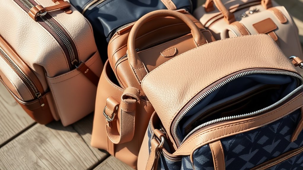 Selecting the right materials is essential to ensuring your designer diaper bag stays durable through daily use. I look for high-quality options like faux leather, vegan leather, or nylon because they stand up to wear and tear. Durable hardware, such as YKK zippers and reinforced stitching, also plays a pivotal role in preventing damage over time. Water-resistant fabrics are a must, as they protect your belongings from spills and weather, prolonging the bag’s lifespan. I also prioritize materials that resist stains and scratches, so my bag continues to look new despite frequent handling and outdoor adventures. Choosing sturdy, resilient materials means I get a stylish, functional diaper bag that can handle the demands of busy days without sacrificing appearance or performance.