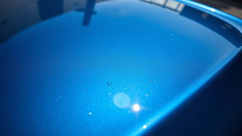 Hydrophobic properties are a key factor to contemplate when evaluating DIY ceramic coating kits because they directly influence how well your vehicle repels water and contaminants. A highly hydrophobic coating causes water to bead up and roll off, minimizing water spots and streaks. This also helps repel dirt, oil, and other pollutants, keeping your car cleaner longer. The effectiveness of hydrophobicity is often measured by contact angle, with higher angles indicating better water repellency. Superior hydrophobic traits improve drying times after washing, as water quickly sheds from the surface. To ensure these benefits last, look for coatings that form durable chemical bonds with your paint, maintaining water resistance over time. This feature not only enhances appearance but also contributes to easier maintenance.