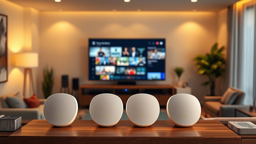 Eero mesh systems are highly scalable, making it easy for me to expand coverage as needed. I simply add more Eero units to strengthen the network in larger homes or tricky spots. The setup is straightforward, and the system automatically integrates new devices seamlessly. This flexibility guarantees my Wi-Fi remains reliable everywhere, no matter how much I grow or change my space.
