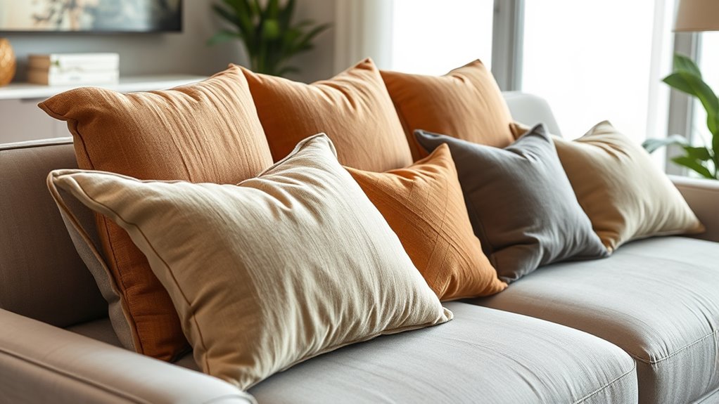 I recommend breathable fabrics like cotton and linen because they allow air to circulate, keeping you cool and comfortable. For durability, polyester blends and microfiber are excellent choices—they resist wear and tear while maintaining softness. I personally prefer natural fibers combined with synthetic ones for the perfect balance of breathability and longevity. These fabrics guarantee your headrest pillow stays comfortable and durable over time, even with frequent use.