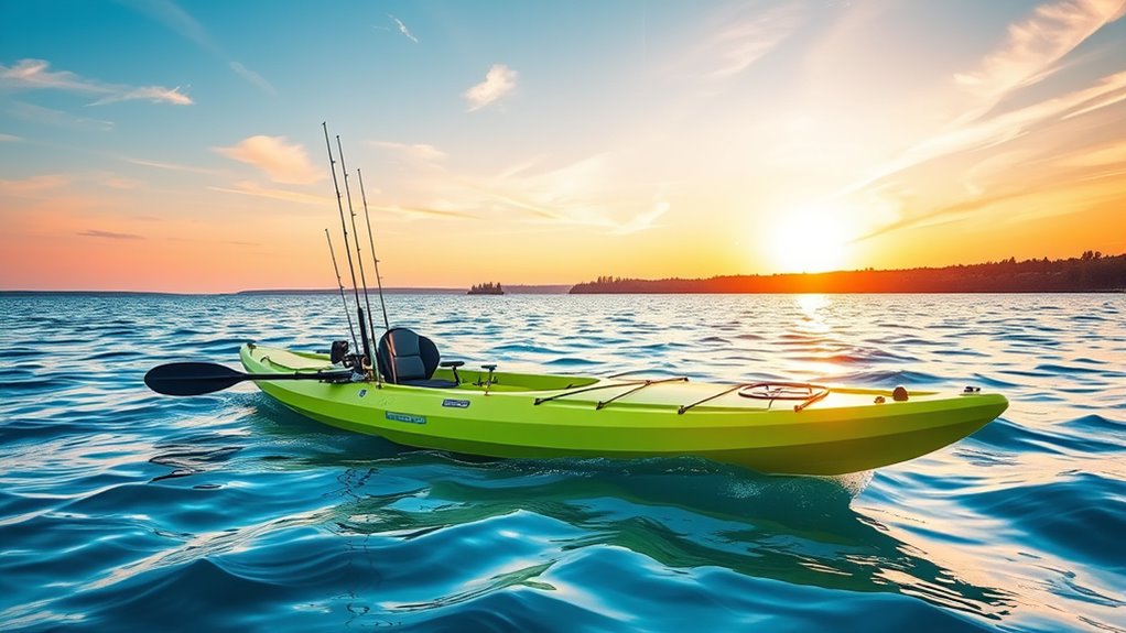 Water conditions play a crucial role in selecting the right fishing kayak package, as the hull design and features must match the environment you’ll paddle in. For calm lakes and rivers, a flat-bottom or multi-chine hull offers excellent stability, making it easier to stand and fish comfortably. If you’re venturing into choppy seas or rougher waters, look for kayaks with enhanced tracking features like skegs or rudders to improve maneuverability and control. Additionally, verify the kayak’s weight capacity can handle your gear and extra equipment needed for demanding conditions. Drain holes or self-bailing features are also essential in rough water, preventing water buildup and keeping you dry. Matching your kayak to your water environment ensures a safer, more enjoyable fishing experience.