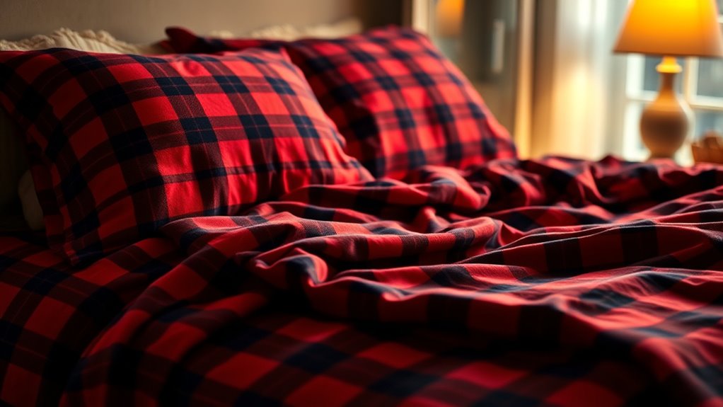 Proper care and maintenance are key to keeping flannel sheets soft, cozy, and long-lasting. I always follow the manufacturer’s instructions, usually washing them in cold water on a gentle cycle to prevent shrinking and fading. Tumble drying on low heat or air drying helps preserve the fabric’s softness and prevents pilling. I avoid using fabric softeners or bleach, as these can damage the fibers and diminish the sheets’ durability. Regular washing also reduces lint buildup and keeps colors vibrant. To boost softness, I add half a cup of white vinegar during washing, which helps with lint reduction and fiber conditioning. By sticking to these simple tips, I ensure my flannel sheets stay cozy, plush, and inviting for many nights of restful sleep.