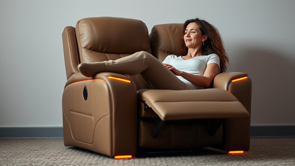 To guarantee maximum safety and comfort, I pay close attention to the recliner’s dimensions, like seat height and backrest length, to make sure they suit a smaller frame. Proper sizing prevents discomfort and ensures adequate support. I also look for adjustable heat and massage functions that target specific areas without overwhelming my petite body. Safety features, such as automatic shut-off timers, are essential to avoid overheating or overly prolonged sessions. An ergonomic design with quality cushioning helps reduce pressure points and provides better support. I prefer models with secure, easy-to-reach remote controls, making it simple to operate heat and massage features safely. These factors help me enjoy relaxing moments without worry, knowing the recliner fits my body perfectly and keeps me safe.