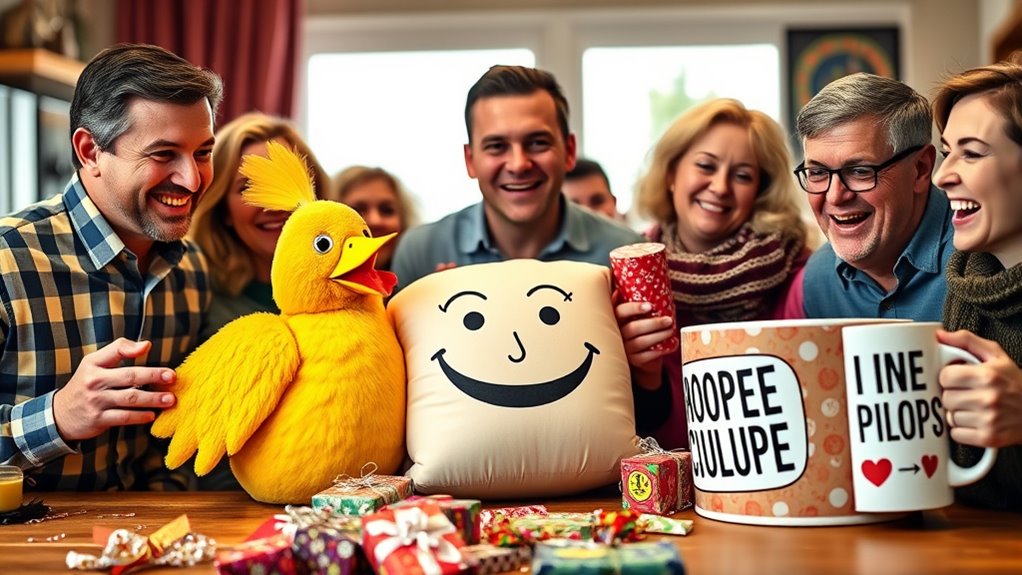 If you’re looking for hilarious gag gifts that will get everyone laughing, I recommend a few standouts. The Funny Shart Survival Kit by Witty Yeti is perfect for bathroom humor lovers, while Accoutrements Emergency Underpants offer instant emergency humor. For fun decision-making, Food Decision Dice are a hit, and the Bacon Air Freshener guarantees laughs and cravings. Finally, quirky gifts for men add a memorable touch. Keep going to discover more top picks and tips for choosing the best hilarious gifts!