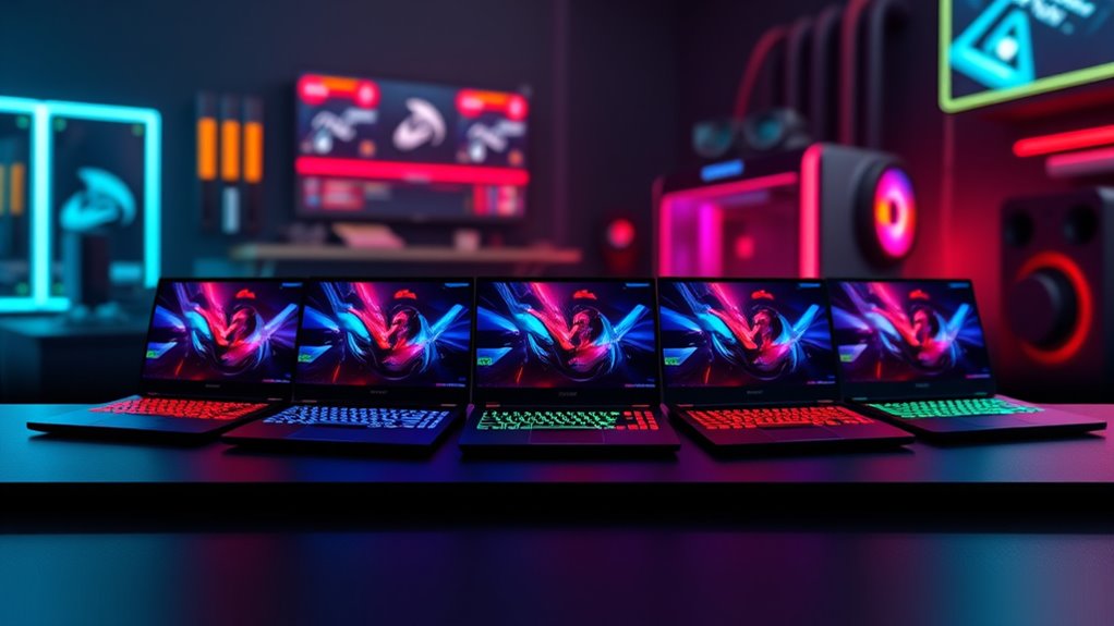 Ever wondered what makes a gaming laptop’s display truly stand out? It all comes down to the details. A high refresh rate, like 120Hz or 144Hz, ensures smoother gameplay and cuts down on motion blur, giving you a competitive edge. An IPS panel is vital for vibrant colors and wider viewing angles, so your visuals stay sharp from any position. A Full HD resolution (1920×1080 or higher) guarantees clear, crisp images during intense gaming sessions. Anti-glare coatings help minimize reflections, making extended play more comfortable and reducing eye strain. Brightness levels of 300 nits or more are essential for visibility in bright environments and for a more immersive experience. Prioritizing these display features ensures a truly enjoyable and visually stunning gaming experience.