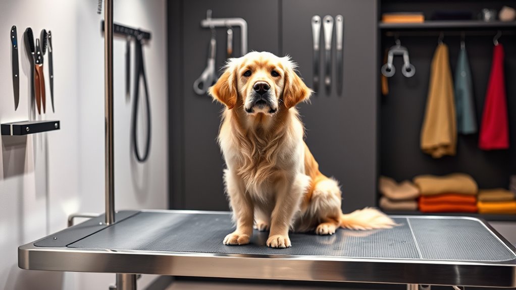 When choosing a grooming table, I look for safety features like non-slip surfaces to prevent slips, sturdy adjustable arms for secure restraint, and rounded edges to avoid injuries. I also prioritize tables with locking mechanisms to keep the table stable during grooming. These features give me peace of mind, knowing my pet is safe and comfortable while I work. Always opt for quality, well-made tables with these safety elements.