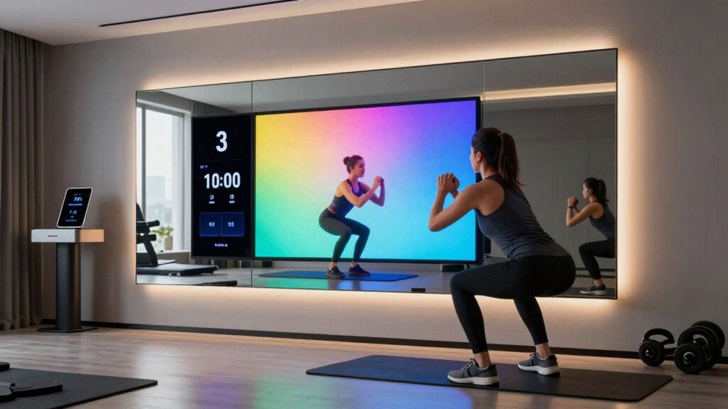 Selecting the right mounting and placement options for your guided workout mirror depends on your available space and how flexible you need your setup to be. Wall-mounted mirrors are popular but require hardware and careful placement to optimize viewing angles—vertical or horizontal mounting can impact your workout area. If space is limited or you want easy repositioning, floor-standing or full-body mirrors on adjustable stands are ideal, especially for multi-use spaces or temporary setups. Foldable or wheeled mirrors offer portability and storage convenience, perfect for small or multi-purpose rooms. Make sure the mounting system is compatible with your wall type, whether drywall, brick, or tile, and can support the mirror’s weight safely. Choosing the right setup guarantees safety, convenience, and an enjoyable workout experience.