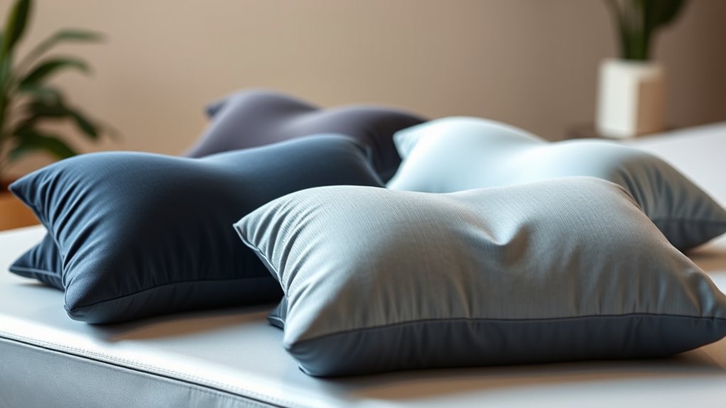 Think of materials like memory foam and natural latex as the trusted friends who support you during recovery. I’ve found memory foam molds perfectly to my neck, providing consistent support, while latex offers a bounciness that keeps things fresh. Data shows memory foam minimizes pressure points, making it ideal for post-workout relief. I recommend choosing a breathable, hypoallergenic material to guarantee comfort and avoid irritation after intense exercise.