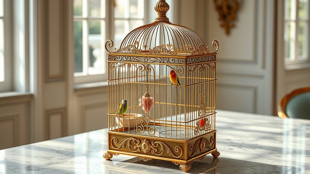 Did you know that regular cleaning can extend your cage’s lifespan by up to 30%? I recommend daily spot cleaning to remove droppings and food debris, and weekly deep cleaning with bird-safe disinfectants. Check for loose bars or hardware monthly, and replace any worn parts promptly. Keeping a consistent maintenance routine guarantees your luxury cage stays pristine, safe, and beautiful for your bird’s health and your satisfaction.