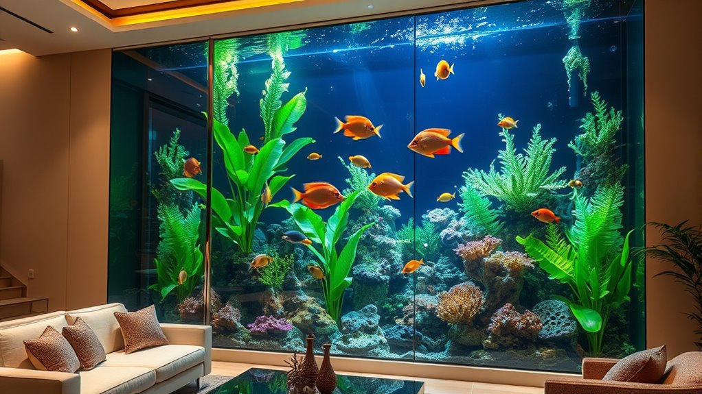 If you’re looking to create an stunning underwater paradise at home, I recommend exploring some of the best high-end fish aquariums. These feature premium materials like starfire glass, sophisticated LED lighting, and advanced filtration systems. They come in various sizes and designs, from sleek rimless tanks to multi-sided displays, perfect for adding both beauty and functionality. Keep exploring to discover detailed options that can elevate your space and keep your aquatic life thriving.