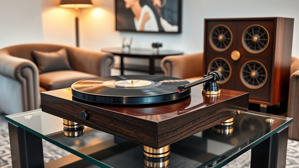 Luxury high-end turntables stand out with sleek, premium materials like polished wood, metal accents, and glass components that exude elegance. They often feature precision-engineered tonearms, vibration-dampening feet, and customizable options for aesthetics and sound tuning. These design elements not only enhance visual appeal but also improve performance, ensuring a superior listening experience that’s both functional and a statement piece in any space.