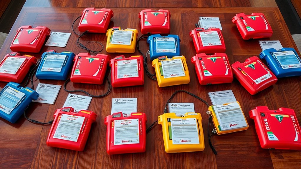 Selecting an AED trainer that’s easy to operate can substantially enhance the training experience for users of all skill levels. I recommend choosing devices with intuitive interfaces, such as clear voice prompts and visual guides, to make learning straightforward. Look for models with simple steps, like automatic power-on and easy scenario selection, to reduce confusion. User-friendly controls, such as touchscreens or single-button functions, help streamline practice sessions. Many kits include quick-start manuals or digital instructions, which lower the learning curve for first-time users. Additionally, devices supporting multiple languages and volume adjustments make training more accessible and comfortable in diverse environments. Prioritizing ease of operation guarantees confidence and effectiveness during practice, ultimately better preparing users for real emergencies.