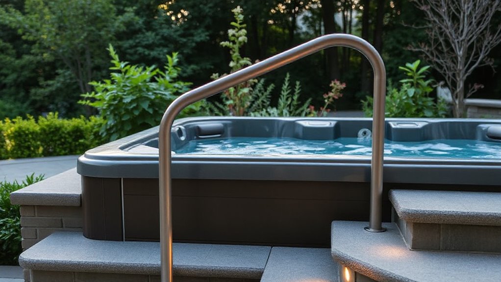 Safety should always be a top priority when selecting hot tub steps with handrails, especially since they’re used in wet and slippery conditions. Anti-slip grips on handrails greatly reduce fall risks during entry and exit, providing a secure hold. Reinforced construction supports weight capacities up to 600 pounds, ensuring safety for everyone. Adding non-slip mats on steps offers extra traction, especially when wet, decreasing slip hazards. Adjustable and swivel handrails allow users to customize positioning for ideal safety and stability. Incorporating dual handrails with sturdy support boosts balance and confidence, particularly for elderly, children, or mobility-impaired users. These safety features collectively create a more secure experience, helping prevent accidents and giving users peace of mind while enjoying their hot tub.