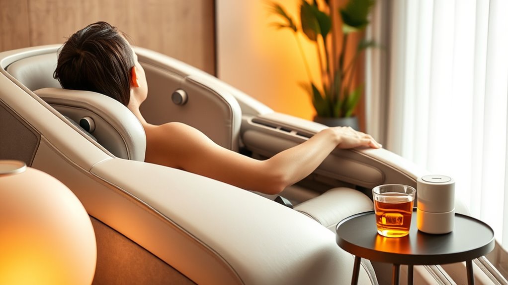 To make certain I can use my back massager comfortably and effectively, I look for models with intuitive controls like simple buttons or touchscreens that don’t require a complicated setup. I prefer devices with pre-programmed modes and automatic shut-off features, which make the experience effortless and safe. Remote controls or app connectivity are especially helpful, allowing me to adjust settings from a distance without interrupting my massage. I also check that the controls are clearly labeled and easy to access, particularly for anyone with limited dexterity or visual impairments. Ultimately, straightforward start and stop functions are essential for quickly beginning or pausing a session without confusion. These features ensure my massage is simple to operate and stress-free.