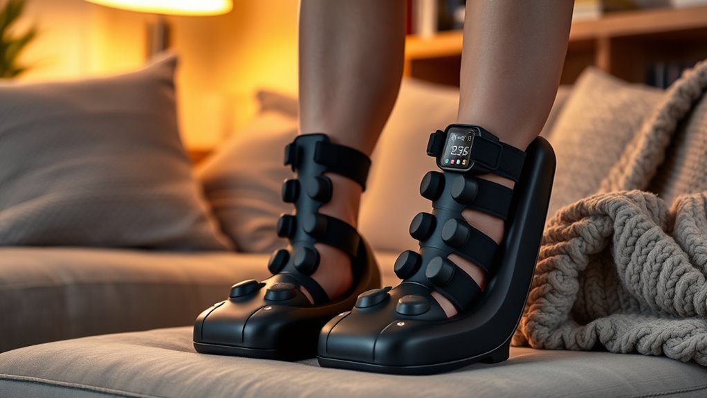 Heat and vibration settings are essential for customizing your massage experience and maximizing relaxation. Multiple heat levels let me choose the perfect warmth, improving circulation and easing muscle tension. The vibration options offer targeted stimulation, helping to soothe tired calves and relieve soreness. I appreciate models with adjustable vibration modes, which allow me to tailor the intensity and focus on specific areas like calves or feet. Consistent heat and vibration boost blood flow, accelerate recovery, and reduce discomfort. Some massagers come with automated or manual controls, making it easy to switch between settings quickly and customize my session. Overall, having flexible heat and vibration options ensures a personalized, effective massage that leaves me feeling refreshed and relaxed.