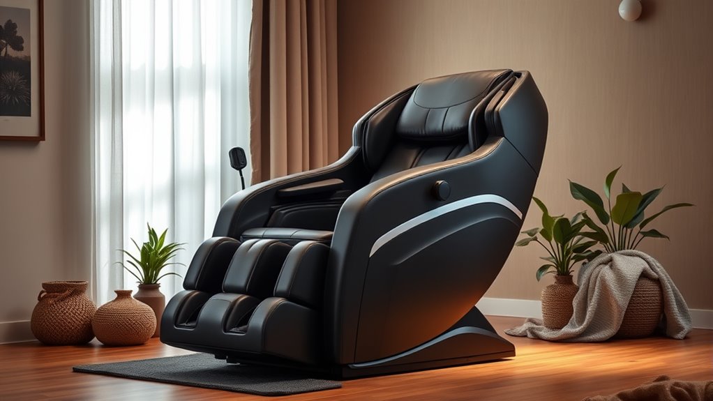 Incorporating heat and air therapy into a massage chair can substantially enhance your relaxation and relief. Heat therapy helps relax muscles, improve blood flow, and reduce tension during and after your session. Air therapy, with strategically placed airbags, applies gentle compression to boost lymphatic flow and alleviate swelling. When combined, these features create a more effective massage by loosening tight muscles and promoting circulation. Many chairs target key zones like the lower back and calves, addressing common pain points directly. Plus, including heat and air therapy in a compact design offers a therapeutic experience without needing extra equipment or space. This integration guarantees you get maximum benefit from every session, making your massage routine more relaxing and effective.