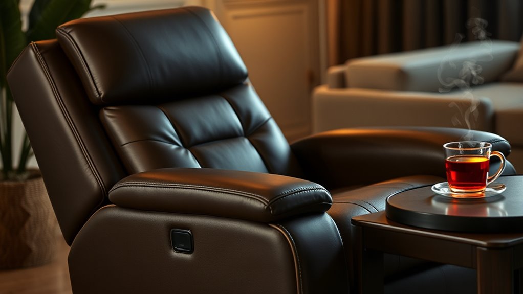 To keep the heat and massage features working perfectly, I regularly clean the recliner with a soft, damp cloth and check for dust or debris in the motor areas. I also follow the manufacturer’s instructions for tightening bolts or replacing filters, if applicable. Occasionally, I run a diagnostic or reset to guarantee everything functions smoothly. Proper maintenance keeps my recliner comfortable, safe, and in top condition for relaxation.