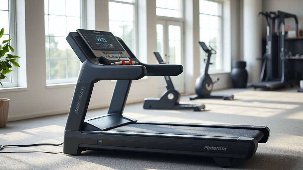Connectivity and extras are essential features that can considerably enhance your home treadmill experience. I recommend choosing models with Bluetooth or Wi-Fi so you can sync your workout data with fitness apps and devices easily. Built-in speakers or audio connectivity options are great for boosting motivation through music or guided sessions, making workouts more enjoyable. Look for treadmills that support app-based control, allowing you to adjust speed, incline, and programs remotely, which adds convenience. Compatibility with heart rate monitors and fitness trackers helps you monitor and optimize training intensity effectively. Additionally, features like Bluetooth speakers or multimedia displays create a more engaging workout environment. These extras not only motivate but also make your training more interactive and personalized, helping you stay committed to your fitness goals.