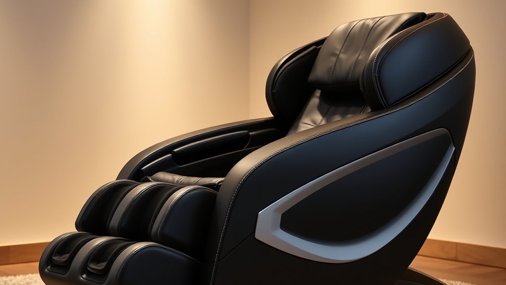 Since convenience is key when using a massage chair, I look for models with an intuitive control interface, like a touchscreen or app, that makes adjusting settings straightforward. Clear labeling and easily accessible buttons help me quickly select and switch between massage modes without hassle. I also appreciate pre-programmed auto modes, which let me enjoy different massages with minimal setup. Hands-free operation via AI voice control is a game-changer, allowing me to customize my massage without touching anything. Features like adjustable intensity and speed, combined with simple instructions, make the overall experience more user-friendly. These aspects guarantee I can relax fully without struggling to operate the chair, making ease of use a top priority in my choice.
