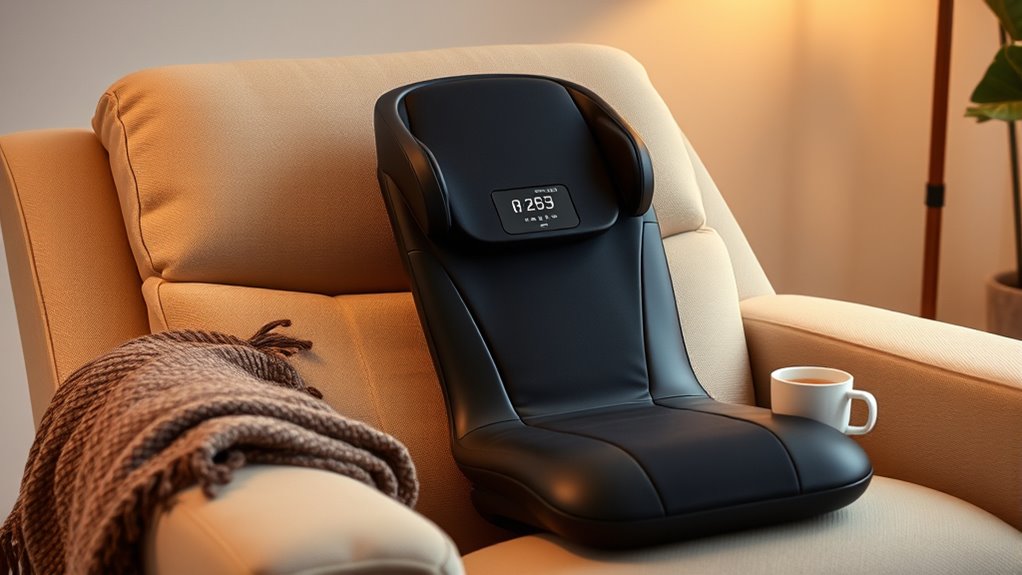 Choosing the right massage technique is essential because it directly impacts how effectively your back muscles relax. Different techniques like finger pressing, kneading, tapping, or a combination of tapping and kneading target muscles differently, offering varied relief options. Having multiple options allows you to customize your massage for specific muscle groups and tension levels, making the experience more effective. Some techniques mimic human touch closely, providing a natural, soothing sensation that enhances relaxation. Keep in mind that effectiveness can vary based on personal preferences and the areas you’re targeting. Selecting a device that offers a range of massage techniques ensures versatility, giving you a thorough approach to easing muscle tension and achieving ultimate relaxation.
